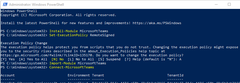 Install-Module MicrosoftTeams Set-ExecutionPolicy RemoteSigned Import-Module MicrosoftTeams Connect-MicrosoftTeams