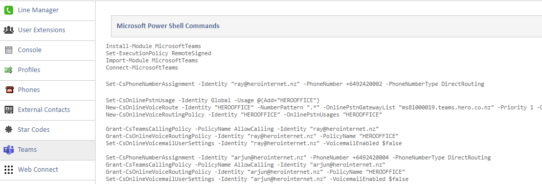 If you have more than a single user then you will need to now map a phone number to each of your Teams users using the following commands. The example below assumes that our example user Lex.d@techconnections.nz is going to be assigned the phone number 092420001 (added to Microsoft with the full country code format as +6492420001) and we are still using the Identity of "VOIP". Replace these as required for your own circumstances.